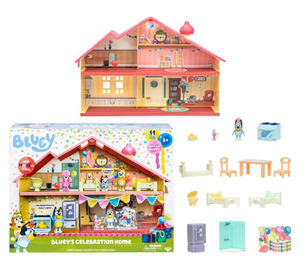 Vive momentos llenos de alegría con la Casa de Celebración de Bluey, un set increíble con dos pisos repletos de detalles, colores y accesorios de fiesta. ¡Perfecto para recrear los mejores momentos del show y celebrar con tus personajes favoritos!